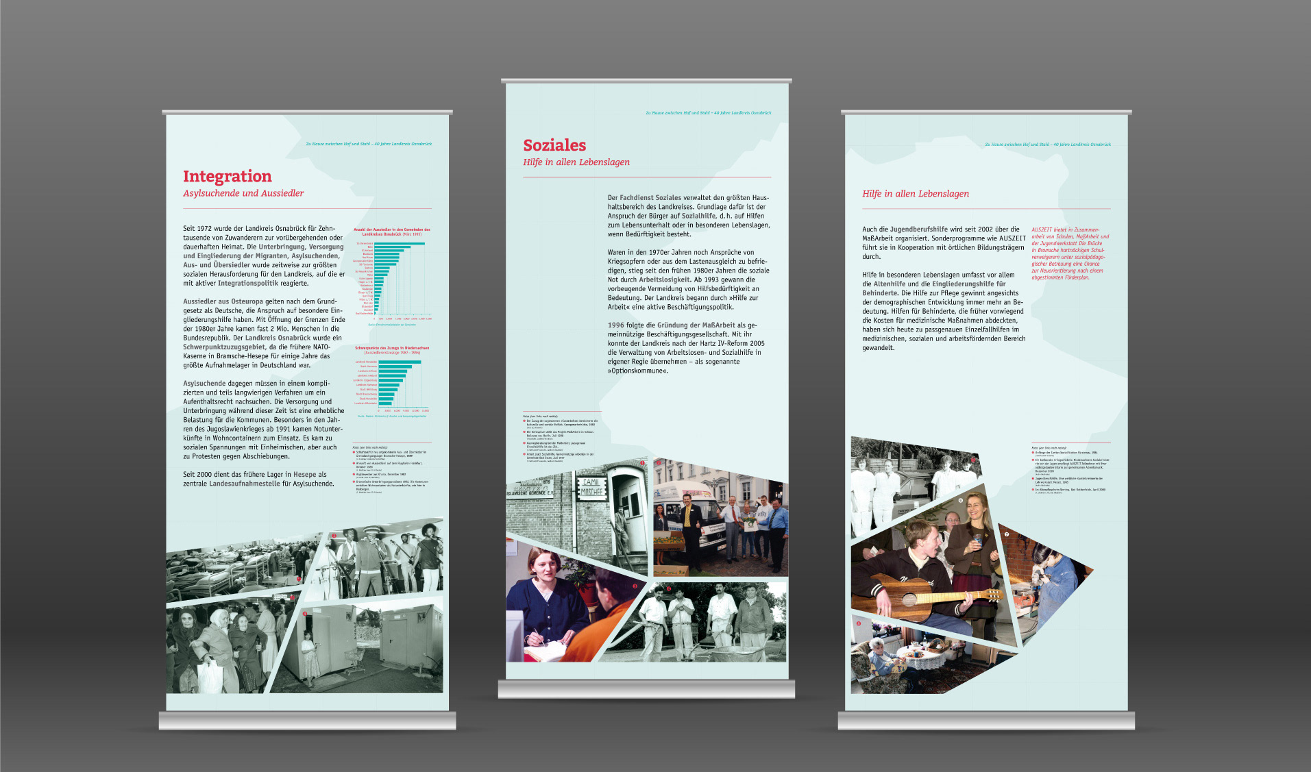 Konzeption und Gestaltung einer historischen Ausstellung zum Jubiläum des Landkreises Osnabrück im Kreishaus Osnabrück. Begleitend zur Austellungseröffnung gab es außerdem eine Einladung mit Antwortkarte. Neben rund 44 Infotafeln zum Thema wurden außerdem Vitrinen mit Design-Elementen der Ausstellungsgestaltung versehen. Grafische Realisation und Konzeption in Kooperation mit Jana Mielke.